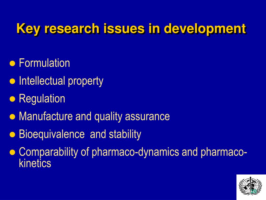 Formulation • Intellectual property • Regulation • Manufacture and quality assurance • Bioequivalence and stability • Comparability of pharmaco-dynamics and pharmaco-kinetics Key research issues in development