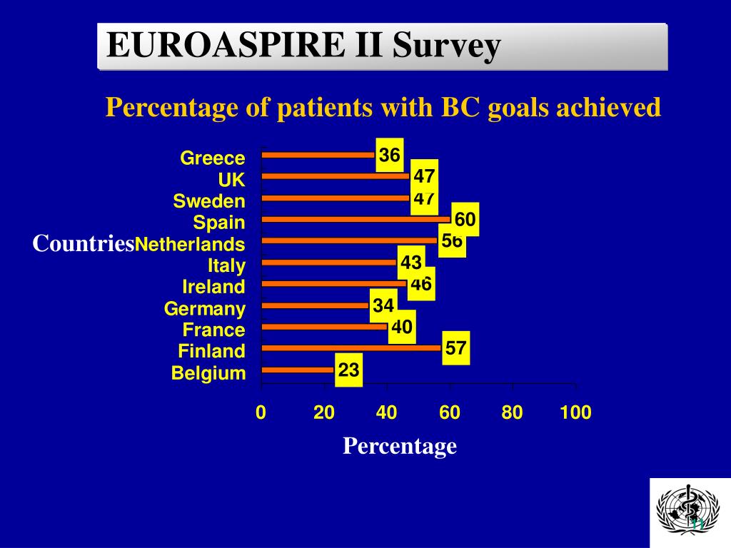 EUROASPIRE II Survey Percentage of patients with BC goals achieved Countries Percentage
