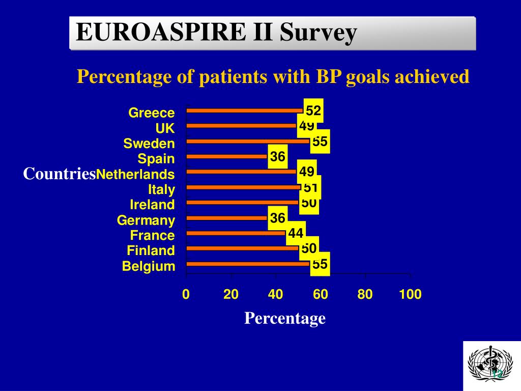 EUROASPIRE II Survey Percentage of patients with BP goals achieved Countries Percentage