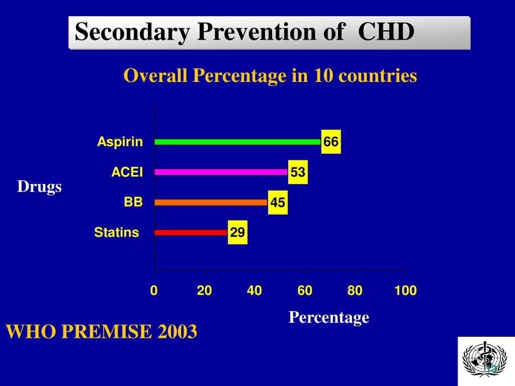 Secondary Prevention of CHD Overall Percentage in 10 countries Drugs Percentage WHO PREMISE 2003