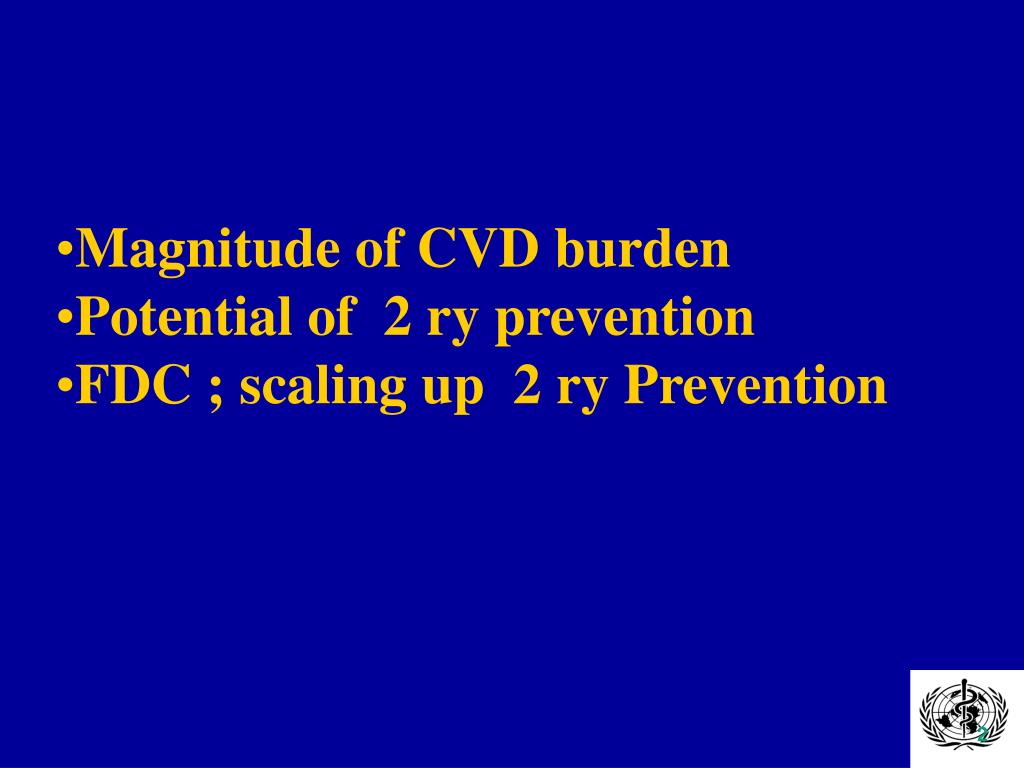 Magnitude of CVD burden • Potential of 2 ry prevention • FDC ; scaling up 2 ry Prevention