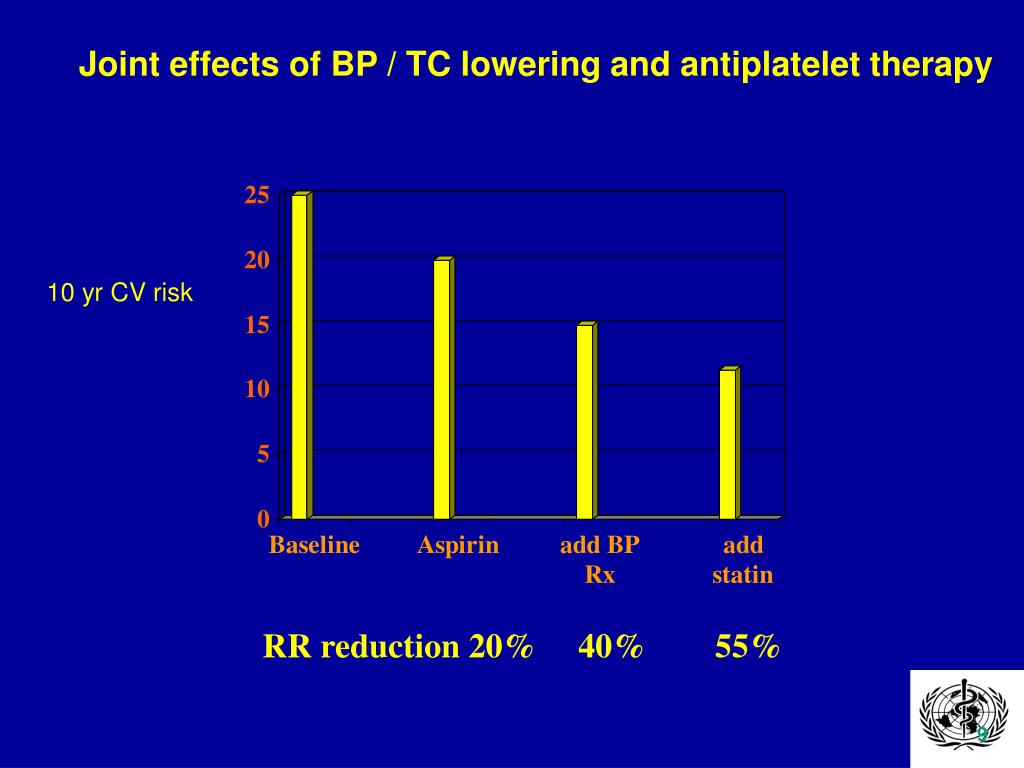 Joint effects of BP / TC lowering and antiplatelet therapy 10 yr CV risk RR reduction 20% 40% 55%
