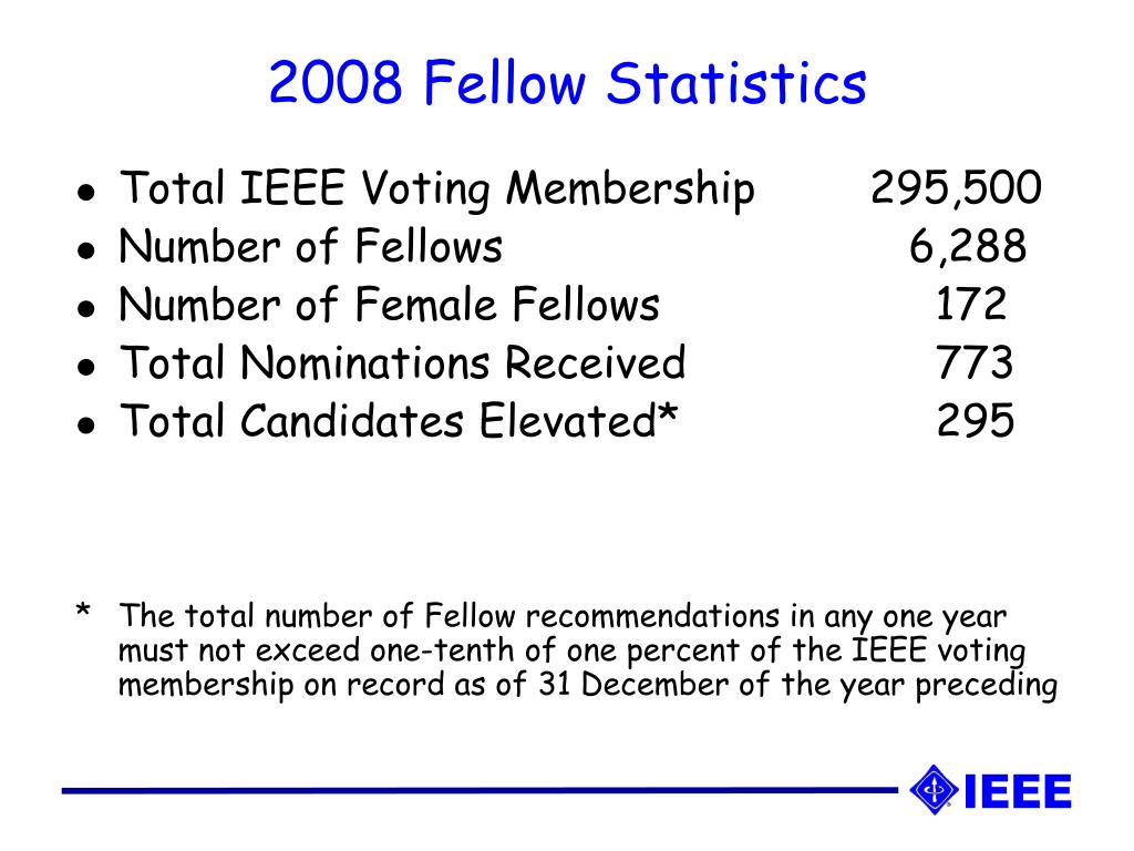 2008 Fellow Statistics • Total IEEE Voting Membership 295,500 • Number of Fellows 6,288 • Number of Female Fellows 172 • Total Nominations Received 773 • Total Candidates Elevated* 295 * The total number of Fellow recommendations in any one year must not exceed one-tenth of one percent of the IEEE voting membership on record as of 31 December of the year preceding