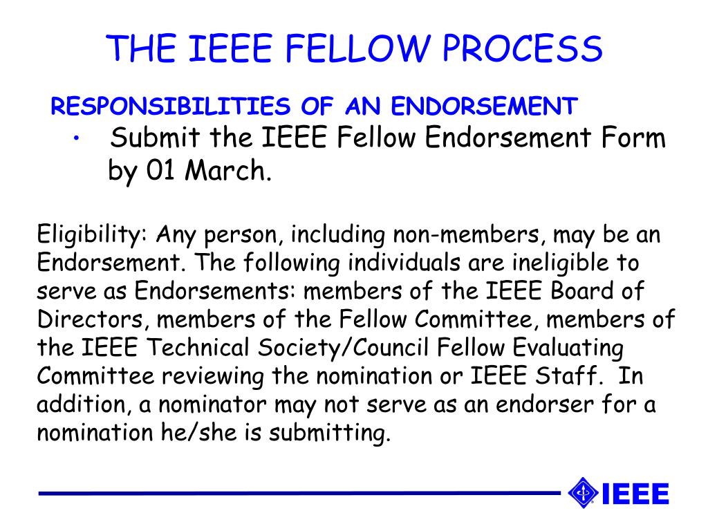 THE IEEE FELLOW PROCESS • RESPONSIBILITIES OF AN ENDORSEMENT • Submit the IEEE Fellow Endorsement Form by 01 March. • Eligibility: Any person, including non-members, may be an Endorsement. The following individuals are ineligible to serve as Endorsements: members of the IEEE Board of Directors, members of the Fellow Committee, members of the IEEE Technical Society/Council Fellow Evaluating Committee reviewing the nomination or IEEE Staff. In addition, a nominator may not serve as an endorser for a nomination he/she is submitting.