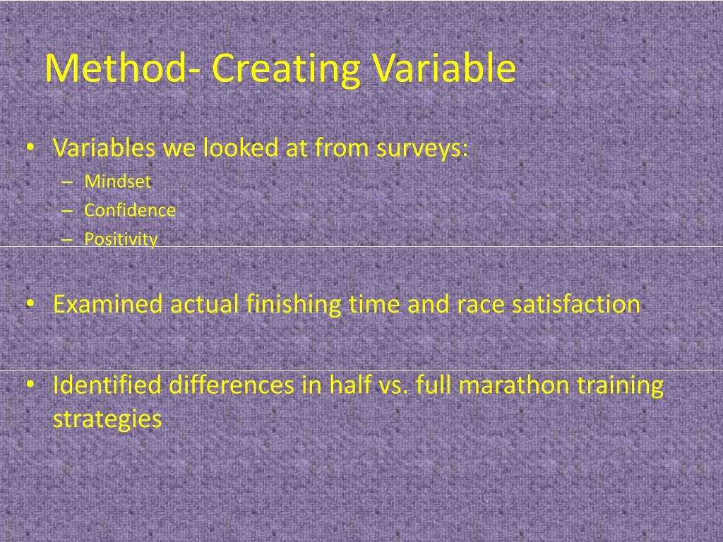 Method- Creating Variable • Variables we looked at from surveys: • Mindset • Confidence • Positivity • Examined actual finishing time and race satisfaction • Identified differences in half vs. full marathon training strategies