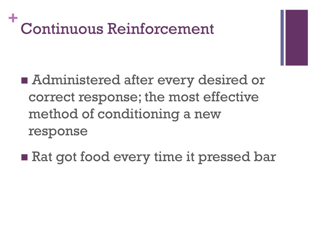 Continuous Reinforcement • Administered after every desired or correct response; the most effective method of conditioning a new response • Rat got food every time it pressed bar