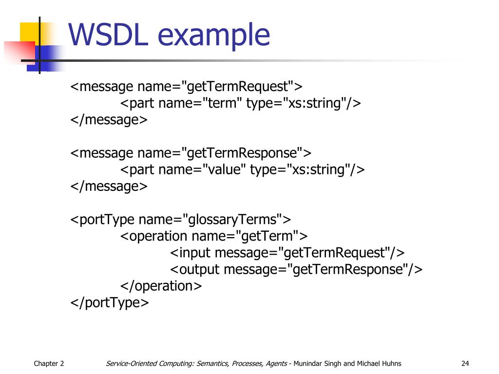 WSDL example <message name="getTermRequest"> <part name="term" type="xs:string"/></message><message name="getTermResponse"> <part name="value" type="xs:string"/></message><portType name="glossaryTerms"> <operation name="getTerm"> <input message="getTermRequest"/> <output message="getTermResponse"/> </operation></portType> Service-Oriented Computing: Semantics, Processes, Agents - Munindar Singh and Michael Huhns