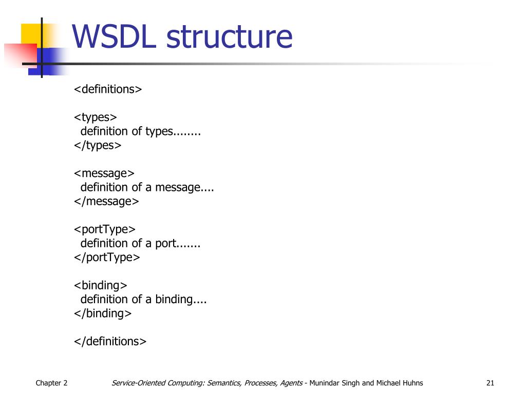 WSDL structure <definitions><types> definition of types........</types><message> definition of a message....</message><portType> definition of a port.......</portType><binding> definition of a binding....</binding></definitions> Service-Oriented Computing: Semantics, Processes, Agents - Munindar Singh and Michael Huhns