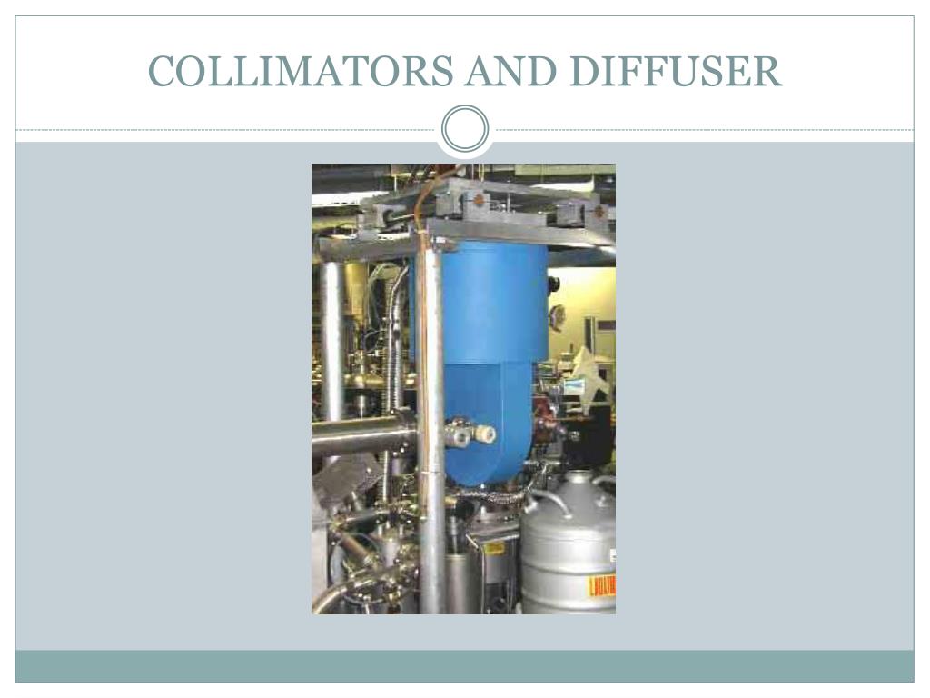 COLLIMATORS AND DIFFUSER • Collimators:σχήμα δαχτυλιδιού, διάμετρο 3 έως 8 mm 1.) beam define collimator 2.) antiscattering collimator -Kαλύτερη εστίαση της δέσμης για ευαίσθητα δείγματαnuclear microprobe systemεστιάζει τη δέσμη με μια σειρά από μαγνητικά τετράπολα
