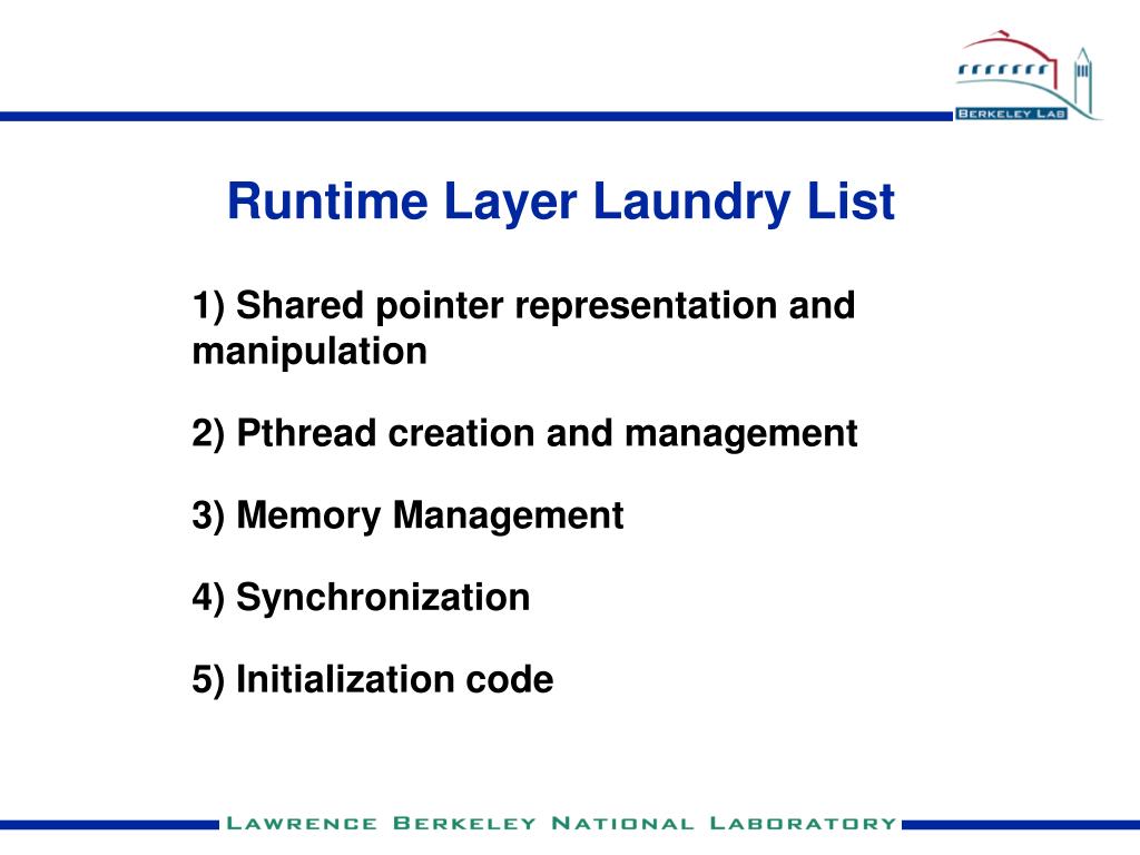 Runtime Layer Laundry List 1) Shared pointer representation and manipulation 2) Pthread creation and management 3) Memory Management 4) Synchronization 5) Initialization code