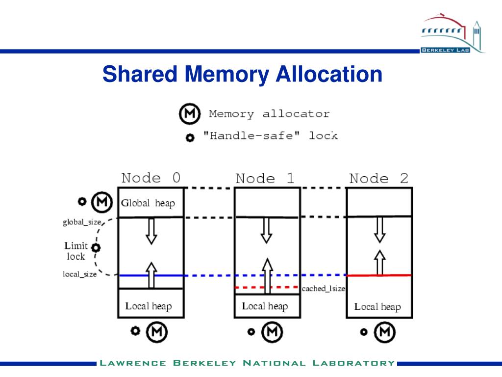 Heap Management GASNet provides a single, fixed network-accessible shared memory region to the Runtime. The Runtime must divide it among threads, and manage separate local and global heap for each thread. Also must prevent regular C heap from expanding into shared region: hook malloc/free to our own, bounded heap.