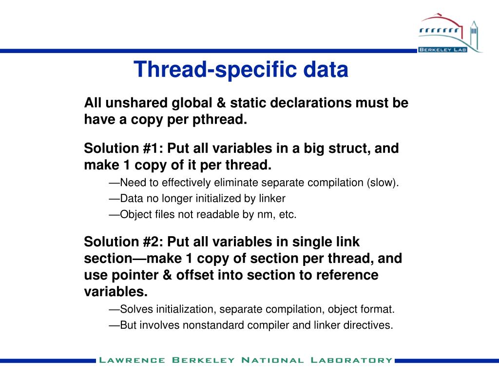 Thread-specific data All unshared global & static declarations must be have a copy per pthread. Solution #1: Put all variables in a big struct, and make 1 copy of it per thread. Need to effectively eliminate separate compilation (slow). Data no longer initialized by linker Object files not readable by nm, etc. Solution #2: Put all variables in single link section—make 1 copy of section per thread, and use pointer & offset into section to reference variables. Solves initialization, separate compilation, object format. But involves nonstandard compiler and linker directives.