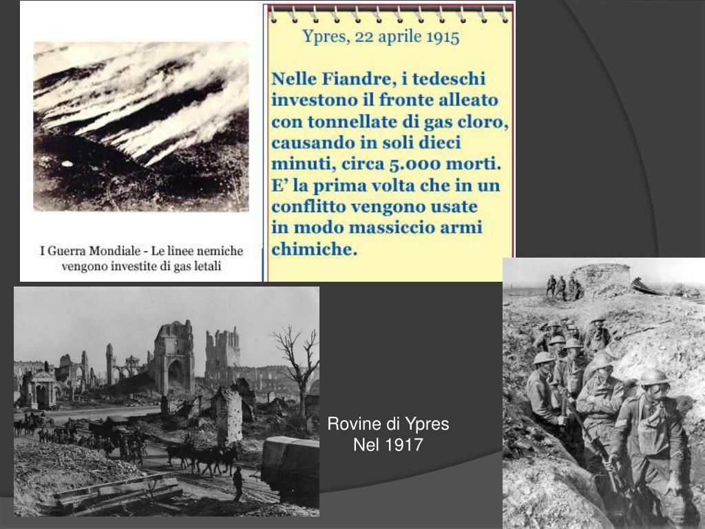 LA GUERRA SOTTOMARINA • Fine del 1914: l’Inghilterra organizza un blocco navale per ostacolare il rifornimento agli Imperi centrali. • La Germania scatena la guerra sottomarina per bloccare il traffico navale verso Francia e Gran Bretagna. • I sommergibili tedeschi affondano però anche navi di stati neutrali o navi passeggeri (episodio del transatlantico Lusitania, dove viaggiavano anche americani). • Altre armi moderne: gas asfissianti (battaglie di Ypres, in Belgio), mitragliatrici, aerei da combattimento, carri armati, lanciafiamme.