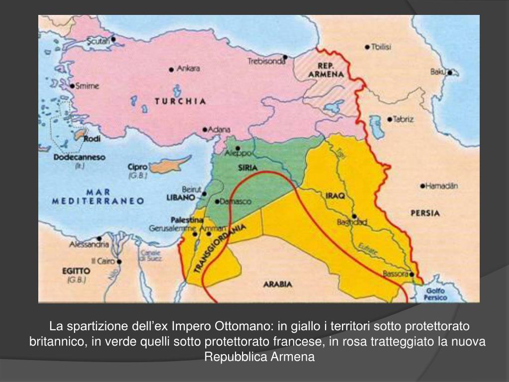 La spartizione dell’ex Impero Ottomano: in giallo i territori sotto protettorato britannico, in verde quelli sotto protettorato francese, in rosa tratteggiato la nuova Repubblica Armena