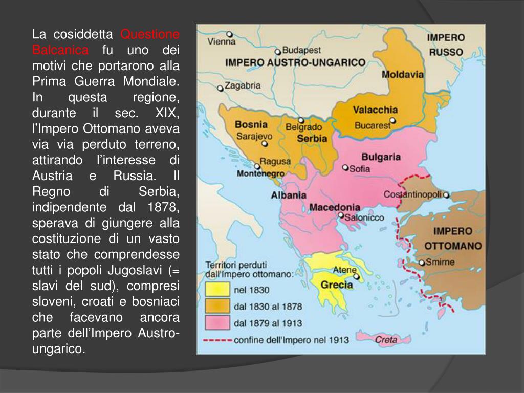 La cosiddetta Questione Balcanica fu uno dei motivi che portarono alla Prima Guerra Mondiale. In questa regione, durante il sec. XIX, l’Impero Ottomano aveva via via perduto terreno, attirando l’interesse di Austria e Russia. Il Regno di Serbia, indipendente dal 1878, sperava di giungere alla costituzione di un vasto stato che comprendesse tutti i popoli Jugoslavi (= slavi del sud), compresi sloveni, croati e bosniaci che facevano ancora parte dell’Impero Austro-ungarico.