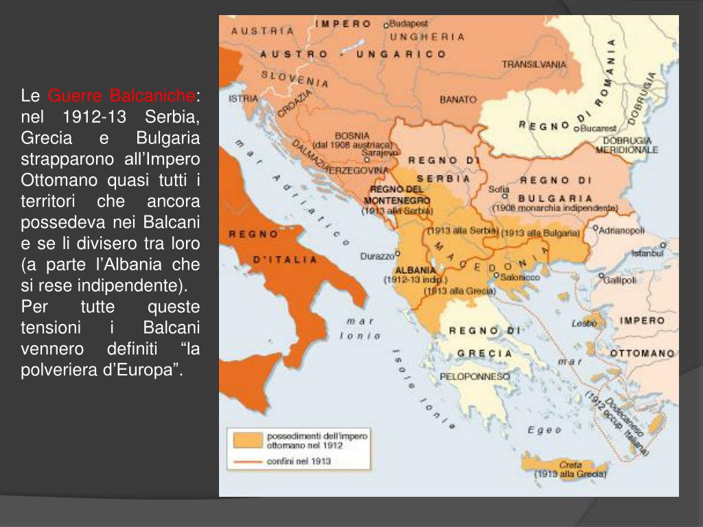 Le Guerre Balcaniche: nel 1912-13 Serbia, Grecia e Bulgaria strapparono all’Impero Ottomano quasi tutti i territori che ancora possedeva nei Balcani e se li divisero tra loro (a parte l’Albania che si rese indipendente). Per tutte queste tensioni i Balcani vennero definiti “la polveriera d’Europa”.