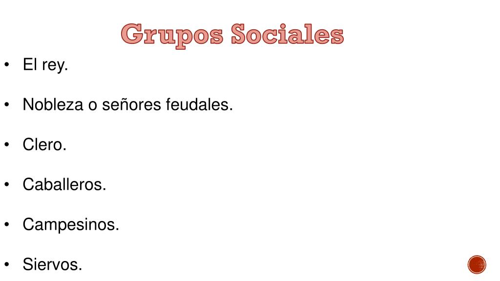 Grupos Sociales • El rey. • Nobleza o señores feudales. • Clero. • Caballeros. • Campesinos. • Siervos.