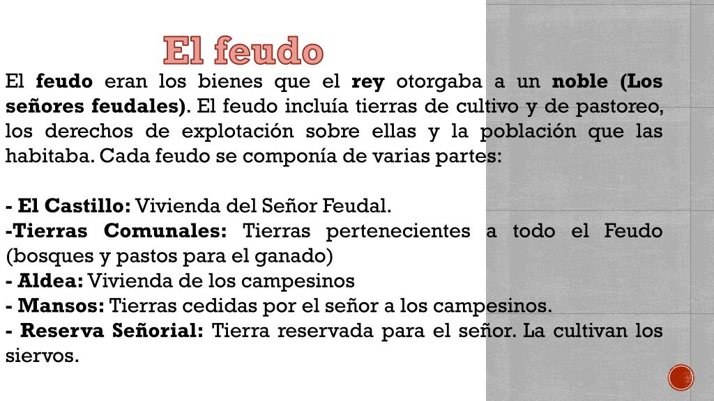 El feudo El feudo eran los bienes que el rey otorgaba a un noble (Los señores feudales). El feudo incluía tierras de cultivo y de pastoreo, los derechos de explotación sobre ellas y la población que las habitaba. Cada feudo se componía de varias partes: - El Castillo: Vivienda del Señor Feudal. -Tierras Comunales: Tierras pertenecientes a todo el Feudo (bosques y pastos para el ganado) - Aldea: Vivienda de los campesinos - Mansos: Tierras cedidas por el señor a los campesinos. - Reserva Señorial: Tierra reservada para el señor. La cultivan los siervos.