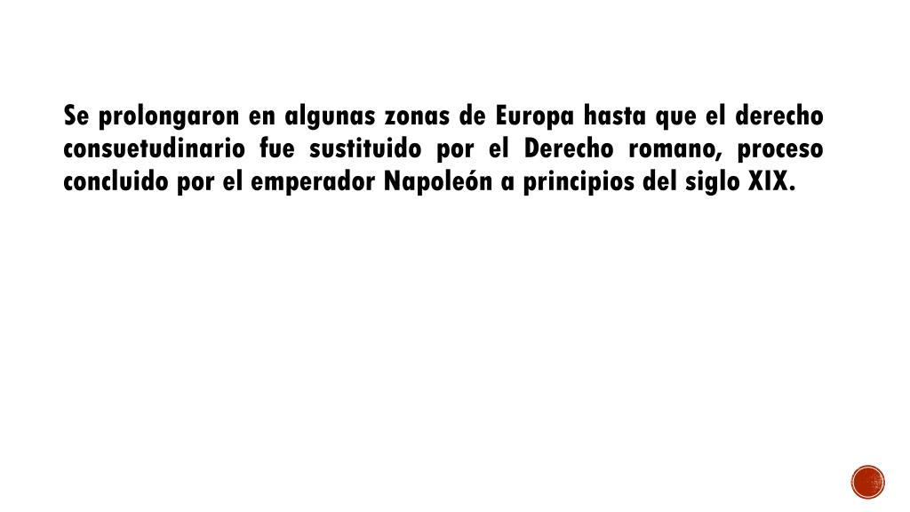 Se prolongaron en algunas zonas de Europa hasta que el derecho consuetudinario fue sustituido por el Derecho romano, proceso concluido por el emperador Napoleón a principios del siglo XIX.