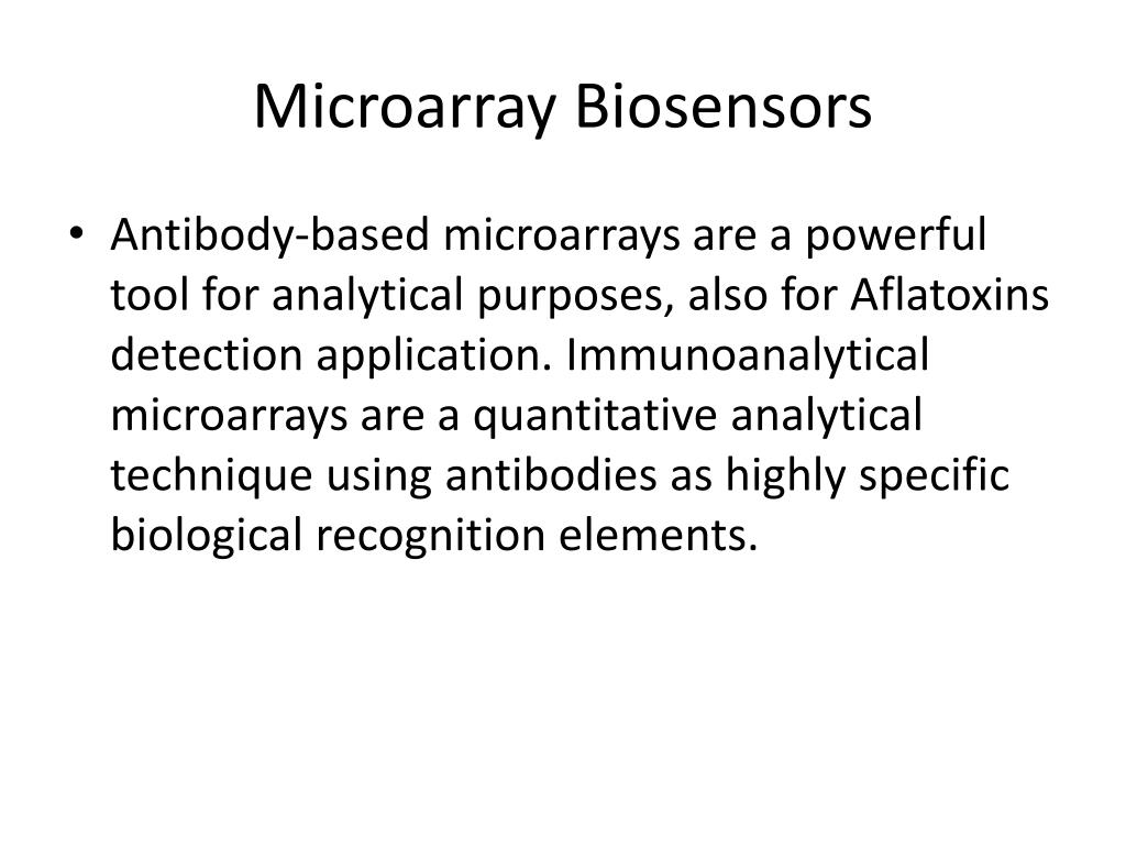 Microarray Biosensors • Antibody-based microarrays are a powerful tool for analytical purposes, also for Aflatoxins detection application. Immunoanalytical microarrays are a quantitative analytical technique using antibodies as highly specific biological recognition elements.