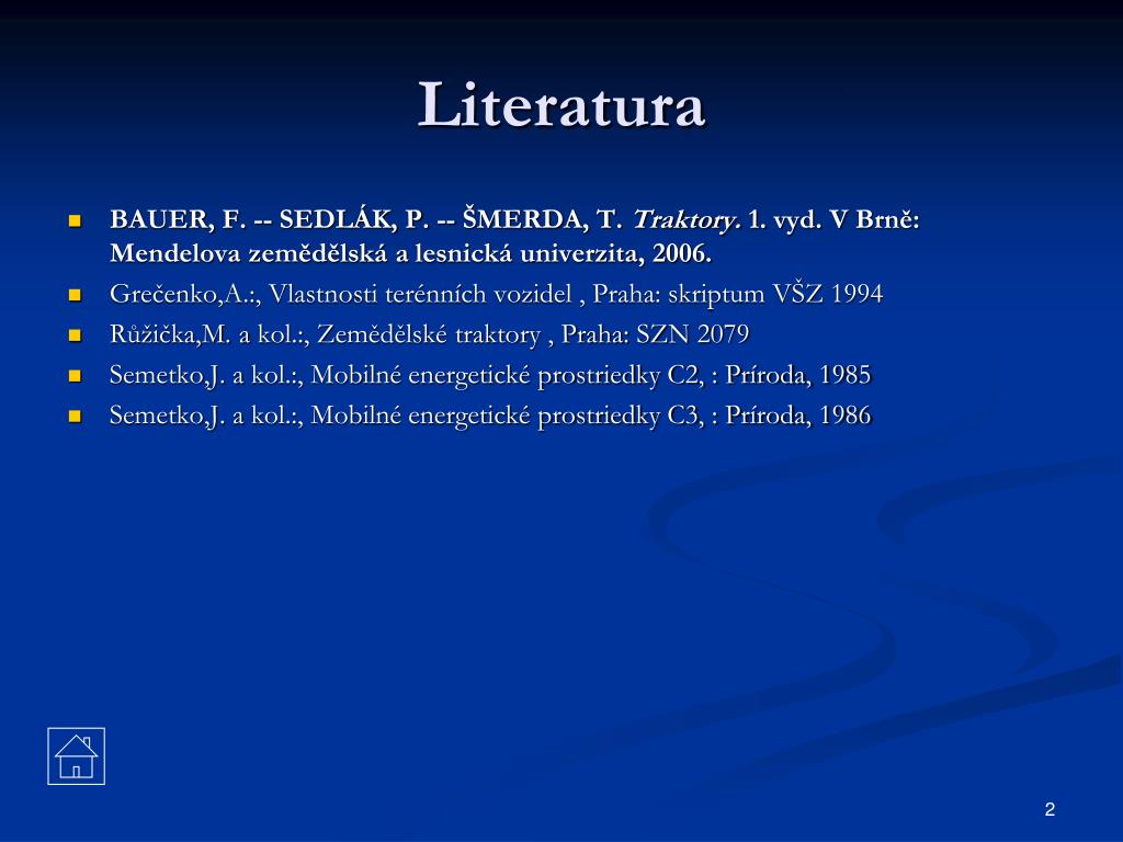 Mobilní energetické prostředky. Literatura. BAUER, F. -- SEDLÁK, P. -- ŠMERDA, T. Traktory. 1. vyd. V Brně: Mendelova zemědělská a lesnická univerzita, 2006. Grečenko,A.:, Vlastnosti terénních vozidel , Praha: skriptum VŠZ 1994 Růžička,M. a kol.:, Zemědělské traktory , Praha: SZN 2079