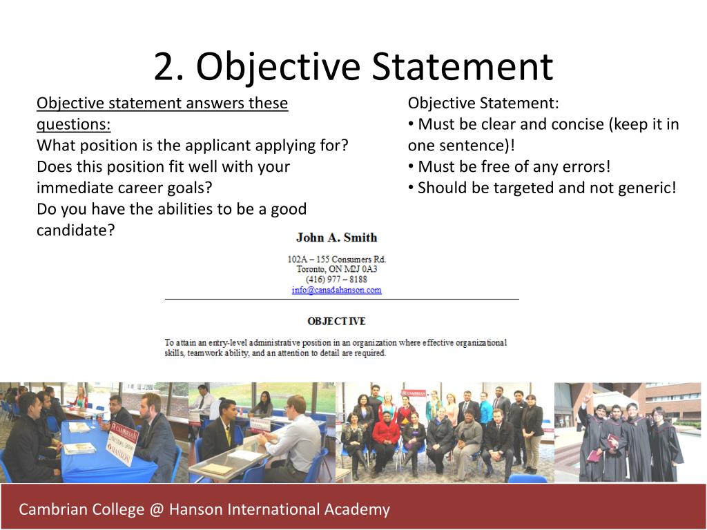 Targeted (good): Objective: To attain a computer hardware sales position in an organization seeking an individual with an extraordinary record of generating new accounts, who exceeds sales targets, and who generates excellent customer relations. Generic (not very good): Objective: To attain a job which allows me to enhance my potential while utilizing my experience in new challenges to benefit the organization. Formula for stating an objective: To attain an X position in an organization [or industry] where Y and Z would be required. [X = the position; Y and Z = qualities and abilities you have that the position would require] Cambrian College @ Hanson International Academy