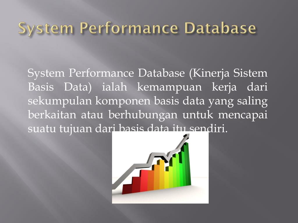 System Performance Database System Performance Database (KinerjaSistem Basis Data) ialahkemampuankerjadarisekumpulankomponen basis data yang salingberkaitanatauberhubunganuntukmencapaisuatutujuandari basis data itusendiri.
