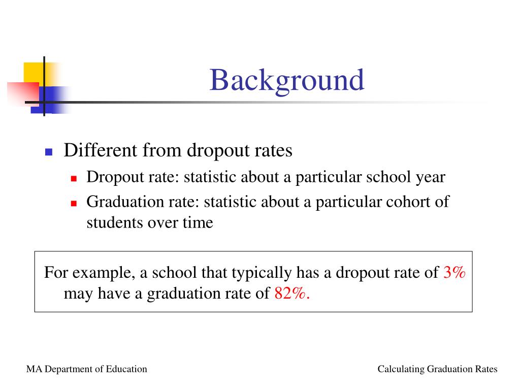 Background • Different from dropout rates • Dropout rate: statistic about a particular school year • Graduation rate: statistic about a particular cohort of students over time For example, a school that typically has a dropout rate of 3% may have a graduation rate of 82%. Calculating Graduation Rates