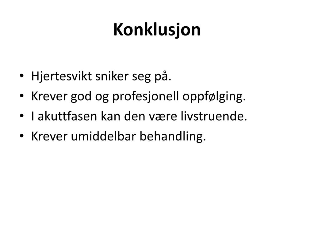 Konklusjon • Hjertesvikt sniker seg på. • Krever god og profesjonell oppfølging. • I akuttfasen kan den være livstruende. • Krever umiddelbar behandling.