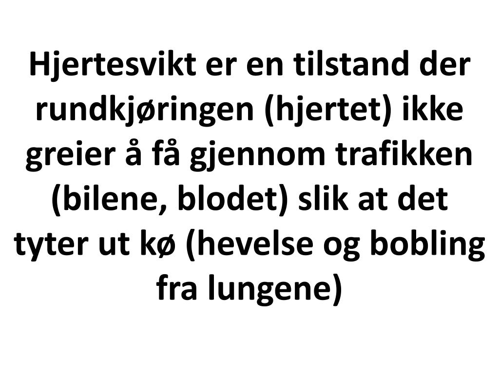 Hjertesvikt er en tilstand der rundkjøringen (hjertet) ikke greier å få gjennom trafikken (bilene, blodet) slik at det tyter ut kø (hevelse og bobling fra lungene)