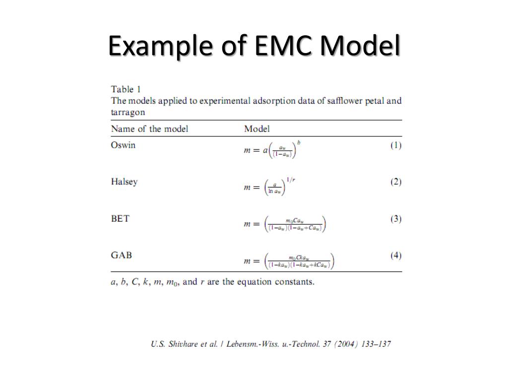 Types of Equations (Models) used to represent EMC Data or Isotherm • 3 variables : RH, MC and T • MC = f (RH, T) • EMC = f (ERH, T) at equilibrium • RH = f (MC, T)