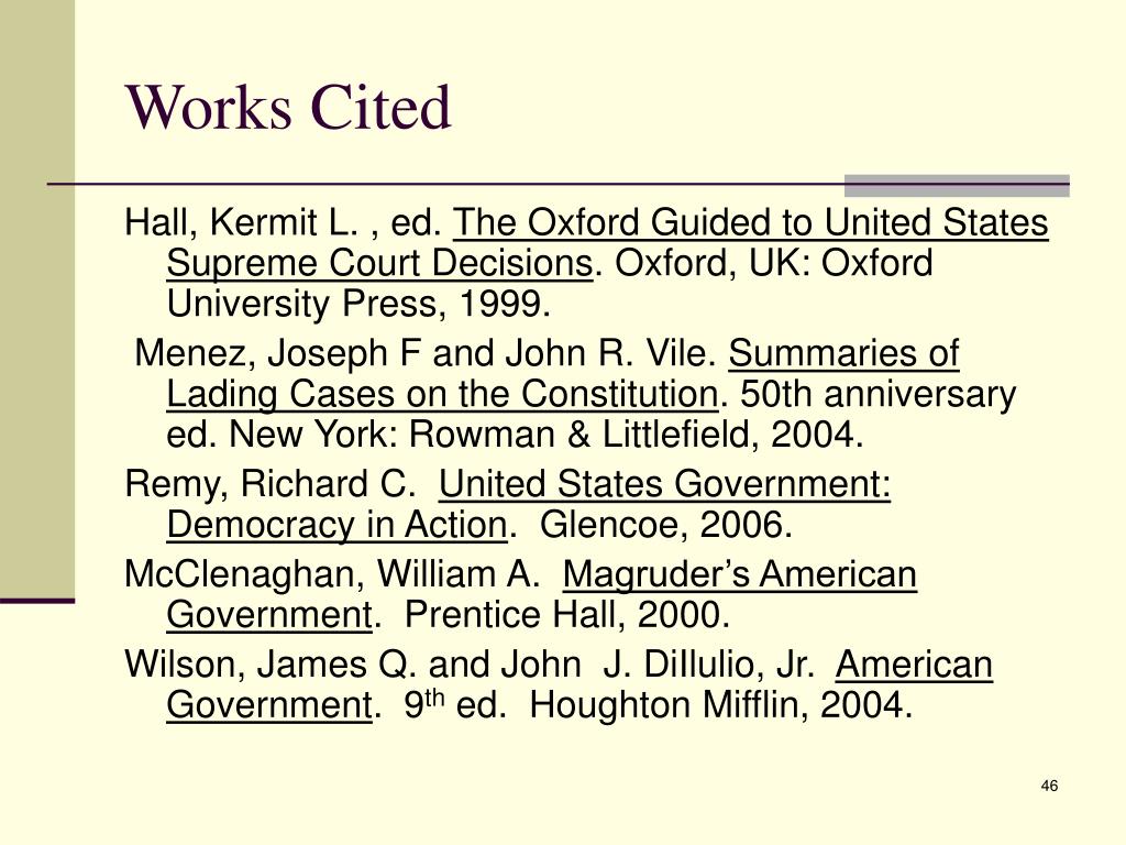 Works Cited Hall, Kermit L. , ed. The Oxford Guided to United States Supreme Court Decisions. Oxford, UK: Oxford University Press, 1999. Menez, Joseph F and John R. Vile. Summaries of Lading Cases on the Constitution. 50th anniversary ed. New York: Rowman & Littlefield, 2004. Remy, Richard C. United States Government: Democracy in Action. Glencoe, 2006. McClenaghan, William A. Magruder’s American Government. Prentice Hall, 2000. Wilson, James Q. and John J. DiIlulio, Jr. American Government. 9th ed. Houghton Mifflin, 2004.