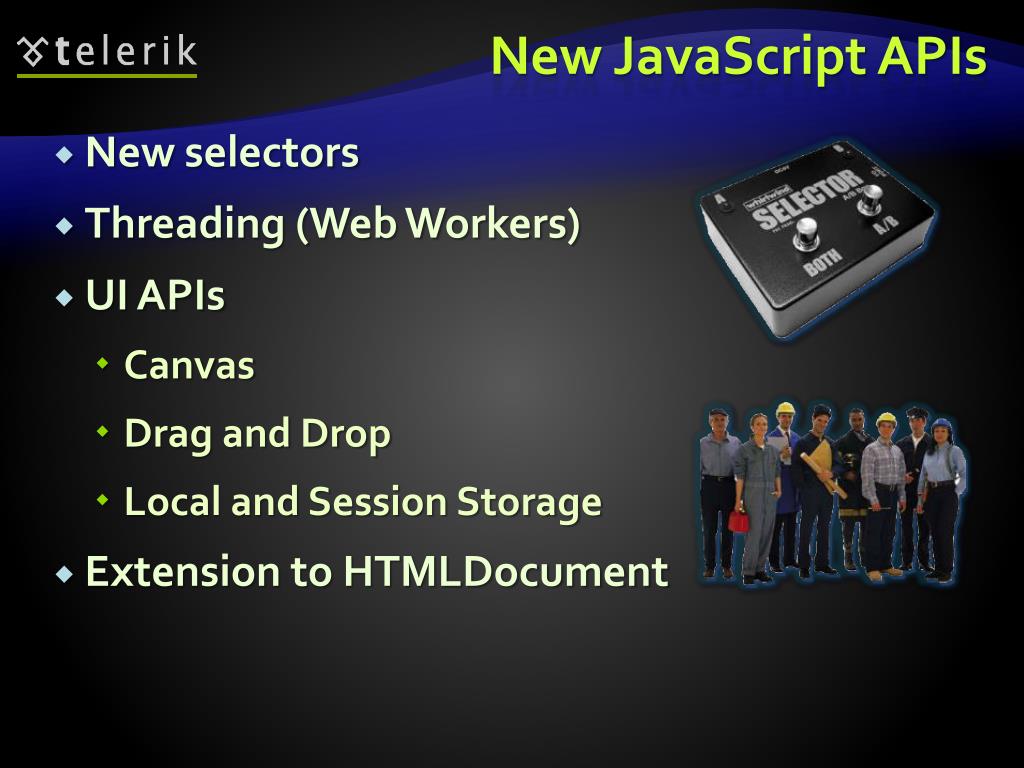 Table of Contents • New JavaScript APIs • New Selectors • Canvas JavaScript API • Web Workers • Drag and Drop • HTML5 Storage • HTML DOM Extensions • Event Listeners