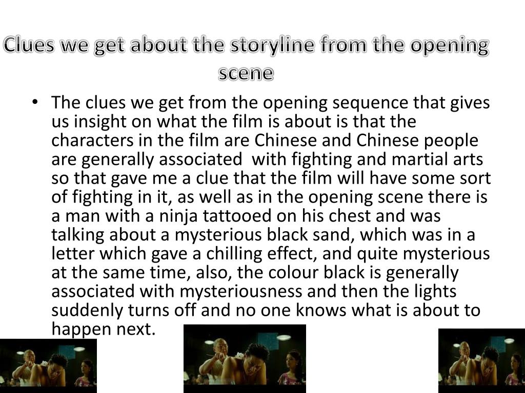 Clues we get about the storyline from the opening scene • The clues we get from the opening sequence that gives us insight on what the film is about is that the characters in the film are Chinese and Chinese people are generally associated with fighting and martial arts so that gave me a clue that the film will have some sort of fighting in it, as well as in the opening scene there is a man with a ninja tattooed on his chest and was talking about a mysterious black sand, which was in a letter which gave a chilling effect, and quite mysterious at the same time, also, the colour black is generally associated with mysteriousness and then the lights suddenly turns off and no one knows what is about to happen next.