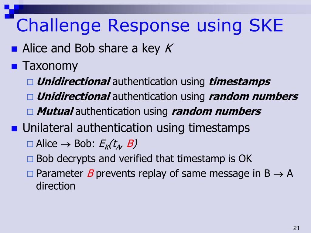 Challenge Response using SKE • Alice and Bob share a key K • Taxonomy • Unidirectional authentication using timestamps • Unidirectional authentication using random numbers • Mutual authentication using random numbers • Unilateral authentication using timestamps • Alice Bob: EK(tA, B) • Bob decrypts and verified that timestamp is OK • Parameter Bprevents replay of same message in B A direction
