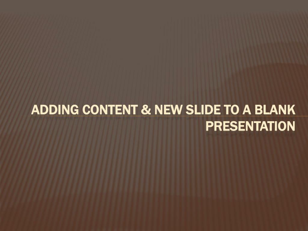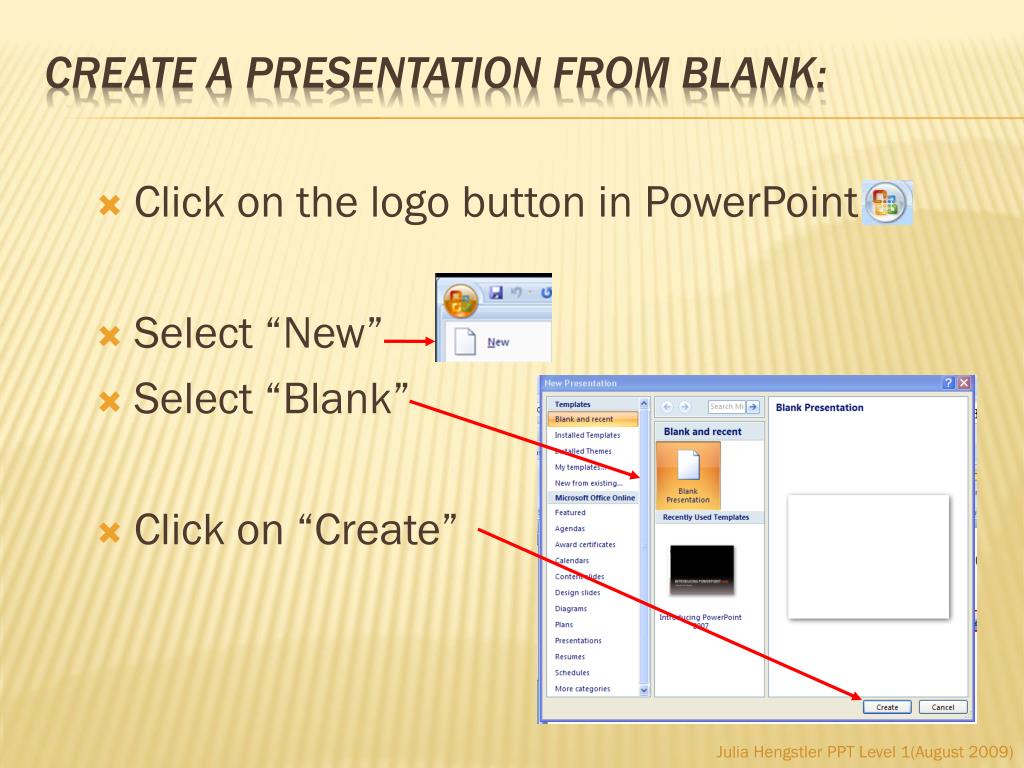 Click on the logo button in PowerPoint • Select “New” • Select “Blank” • Click on “Create” Julia Hengstler PPT Level 1(August 2009) Create a Presentation from Blank: