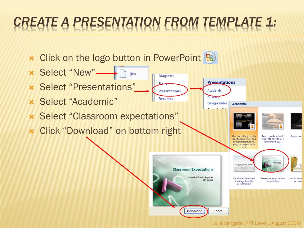 Click on the logo button in PowerPoint • Select “New” • Select “Presentations” • Select “Academic” • Select “Classroom expectations” • Click “Download” on bottom right Julia Hengstler PPT Level 1(August 2009) Create a Presentation from template 1: