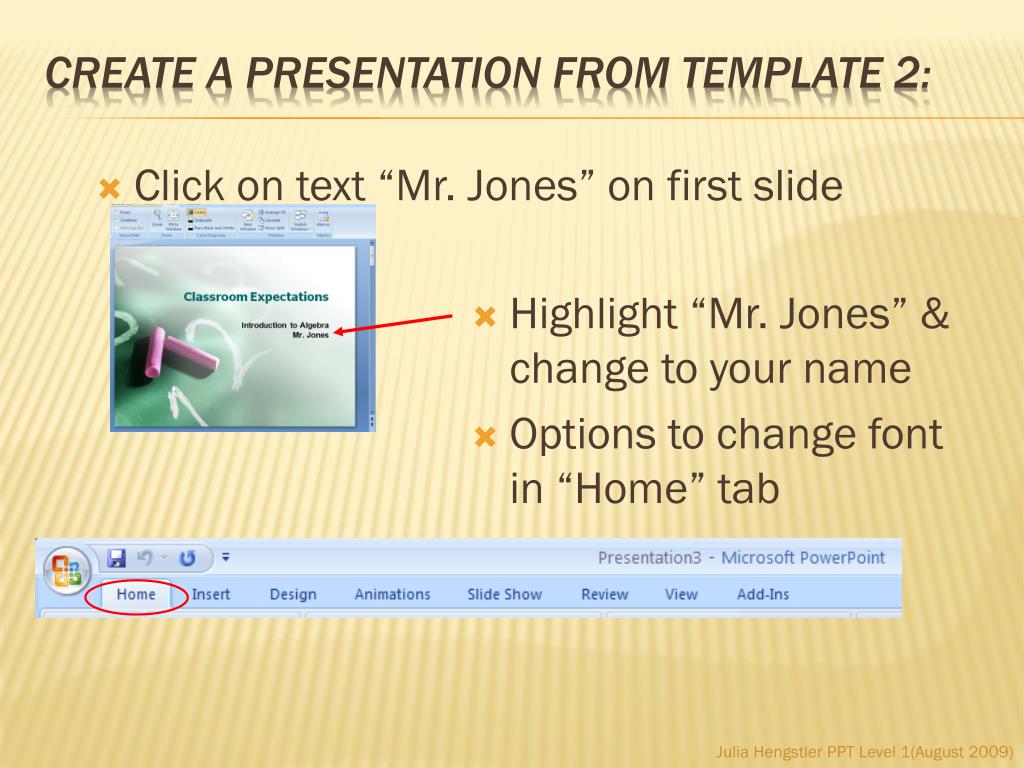 Click on text “Mr. Jones” on first slide Julia Hengstler PPT Level 1(August 2009) Create a Presentation from template 2: • Highlight “Mr. Jones” & change to your name • Options to change font in “Home” tab