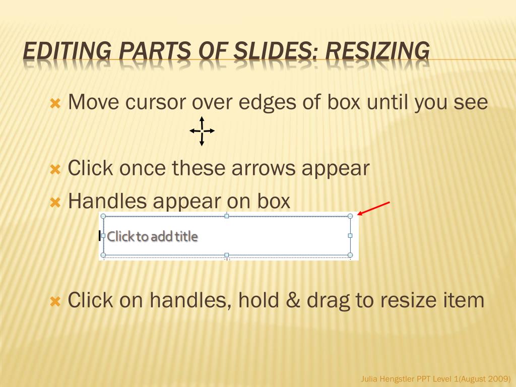 Move cursor over edges of box until you see • Click once these arrows appear • Handles appear on box • Click on handles, hold & drag to resize item Julia Hengstler PPT Level 1(August 2009) Editing parts of slides: Resizing