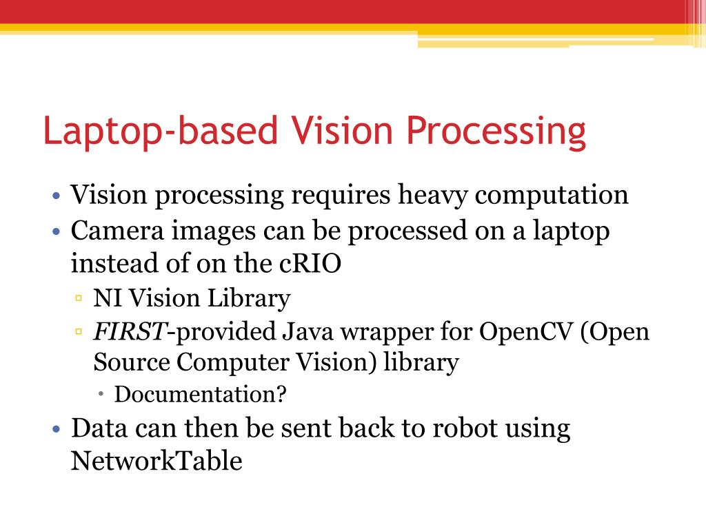 Laptop-based Vision Processing • Vision processing requires heavy computation • Camera images can be processed on a laptop instead of on the cRIO • NI Vision Library • FIRST-provided Java wrapper for OpenCV (Open Source Computer Vision) library • Documentation? • Data can then be sent back to robot using NetworkTable