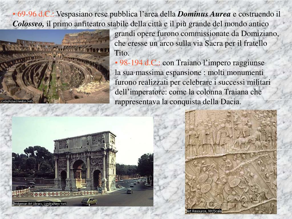 69-96 d.C.: Vespasiano rese pubblica l’area della Dominus Aurea e costruendo il Colosseo, il primo anfiteatro stabile della città e il più grande del mondo antico • grandi opere furono commissionate da Domiziano, che eresse un arco sulla via Sacra per il fratello Tito. • 98-194 d.C.: con Traiano l’impero raggiunse la sua massima espansione : molti monumenti furono realizzati per celebrare i successi militari dell’imperatore: come la colonna Traiana che rappresentava la conquista della Dacia.