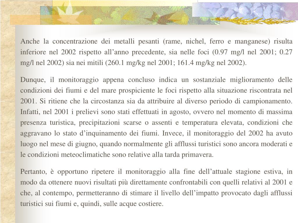 Anche la concentrazione dei metalli pesanti (rame, nichel, ferro e manganese) risulta inferiore nel 2002 rispetto all’anno precedente, sia nelle foci (0.97 mg/l nel 2001; 0.27 mg/l nel 2002) sia nei mitili (260.1 mg/kg nel 2001; 161.4 mg/kg nel 2002). Dunque, il monitoraggio appena concluso indica un sostanziale miglioramento delle condizioni dei fiumi e del mare prospiciente le foci rispetto alla situazione riscontrata nel 2001. Si ritiene che la circostanza sia da attribuire al diverso periodo di campionamento. Infatti, nel 2001 i prelievi sono stati effettuati in agosto, ovvero nel momento di massima presenza turistica, precipitazioni scarse o assenti e temperatura elevata, condizioni che aggravano lo stato d’inquinamento dei fiumi. Invece, il monitoraggio del 2002 ha avuto luogo nel mese di giugno, quando normalmente gli afflussi turistici sono ancora moderati e le condizioni meteoclimatiche sono relative alla tarda primavera. Pertanto, è opportuno ripetere il monitoraggio alla fine dell’attuale stagione estiva, in modo da ottenere nuovi risultati più direttamente confrontabili con quelli relativi al 2001 e che, al contempo, permetteranno di stimare il livello dell’impatto provocato dagli afflussi turistici sui fiumi e, quindi, sulle acque costiere.
