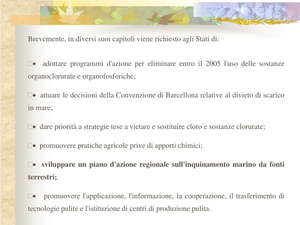 Brevemente, in diversi suoi capitoli viene richiesto agli Stati di: • · adottare programmi d'azione per eliminare entro il 2005 l'uso delle sostanze organoclorurate e organofosforiche; • · attuare le decisioni della Convenzione di Barcellona relative al divieto di scarico in mare; • · dare priorità a strategie tese a vietare e sostituire cloro e sostanze clorurate; • · promuovere pratiche agricole prive di apporti chimici; • ·sviluppare un piano d'azione regionale sull'inquinamento marino da fonti terrestri; • · promuovere l'applicazione, l'informazione, la cooperazione, il trasferimento di tecnologie pulite e l'istituzione di centri di produzione pulita.