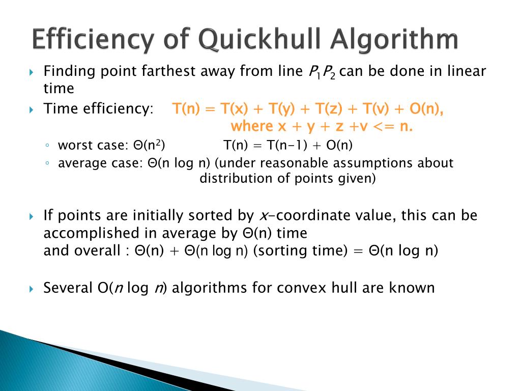 Efficiency of Quickhull Algorithm • Finding point farthest away from line P1P2 can be done in linear time • Time efficiency: T(n) = T(x) + T(y) + T(z) + T(v) + O(n), where x + y + z +v <= n. • worst case: Θ(n2) T(n) = T(n-1) + O(n) • average case: Θ(n log n) (under reasonable assumptions about distribution of points given) • If points are initially sorted by x-coordinate value, this can be accomplished in average by Θ(n) time and overall : Θ(n) + Θ(n log n) (sorting time) = Θ(n log n) • Several O(n log n) algorithms for convex hull are known
