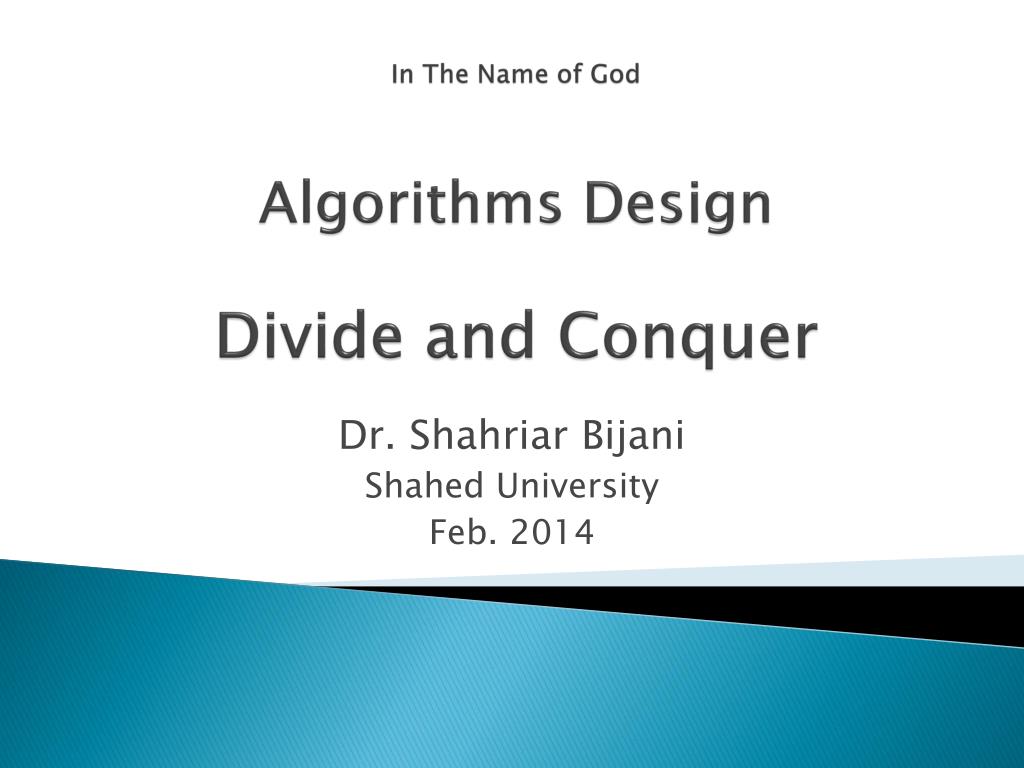 In The Name of God Algorithms Design Divide and Conquer. Dr. Shahriar Bijani Shahed University Feb. 2014. Slides References. Utah State University , Changhui Yan,CS5050, Spring 2007. National Tsing Hua University , Chuan Yi Tang, fall 2006.