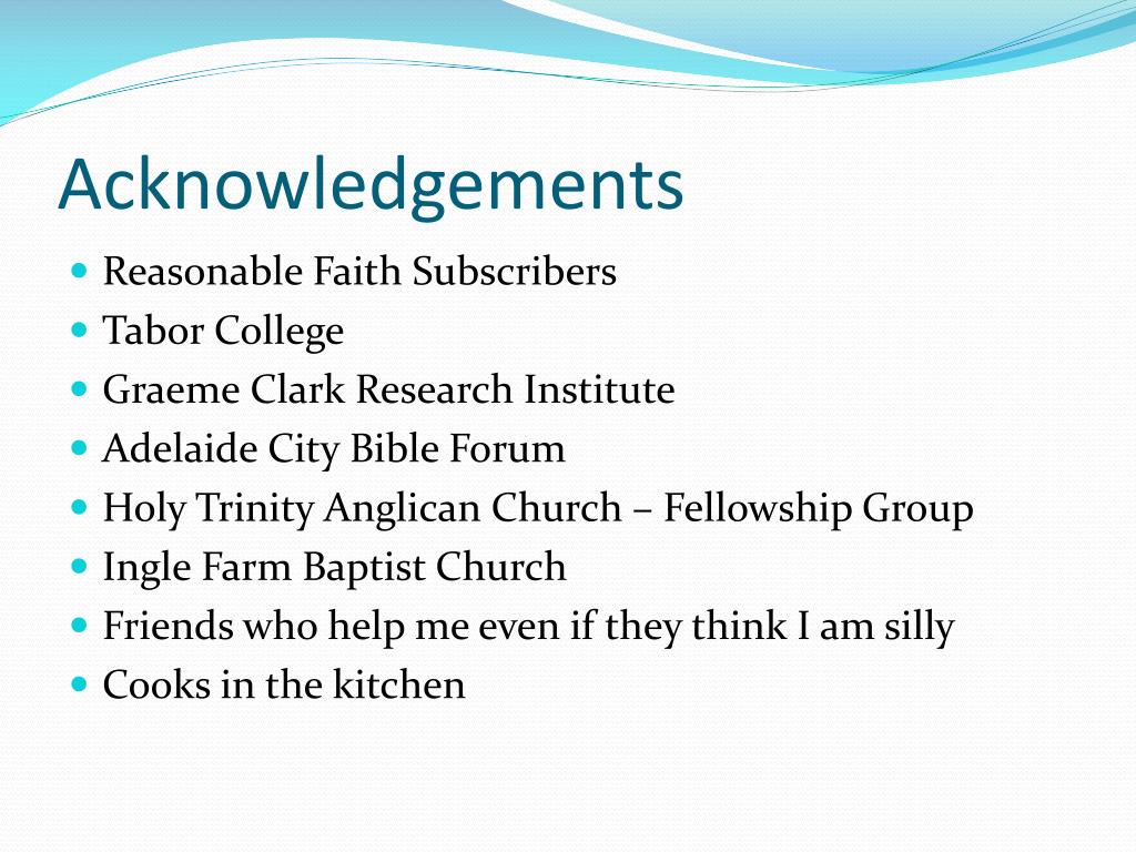 Acknowledgements • Reasonable Faith Subscribers • Tabor College • Graeme Clark Research Institute • Adelaide City Bible Forum • Holy Trinity Anglican Church – Fellowship Group • Ingle Farm Baptist Church • Friends who help me even if they think I am silly • Cooks in the kitchen