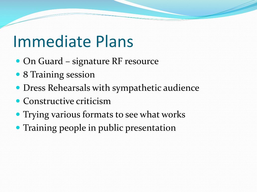 Immediate Plans • On Guard – signature RF resource • 8 Training session • Dress Rehearsals with sympathetic audience • Constructive criticism • Trying various formats to see what works • Training people in public presentation