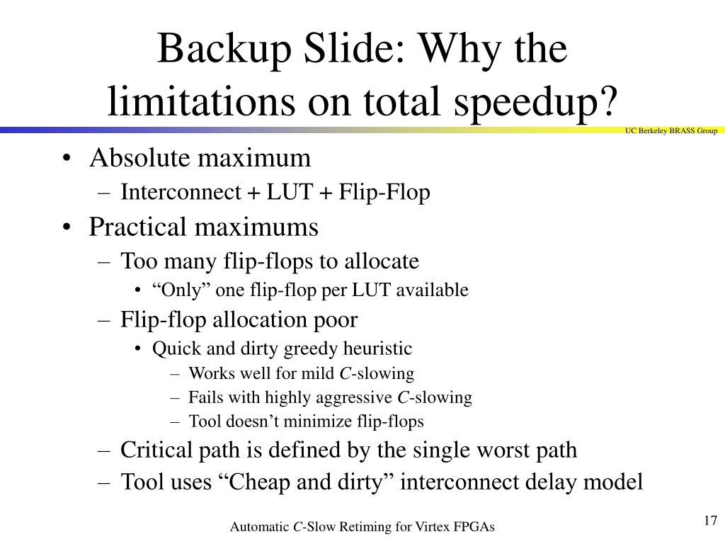 Backup Slide: Why the limitations on total speedup? • Absolute maximum • Interconnect + LUT + Flip-Flop • Practical maximums • Too many flip-flops to allocate • “Only” one flip-flop per LUT available • Flip-flop allocation poor • Quick and dirty greedy heuristic • Works well for mild C-slowing • Fails with highly aggressive C-slowing • Tool doesn’t minimize flip-flops • Critical path is defined by the single worst path • Tool uses “Cheap and dirty” interconnect delay model Automatic C-Slow Retiming for Virtex FPGAs