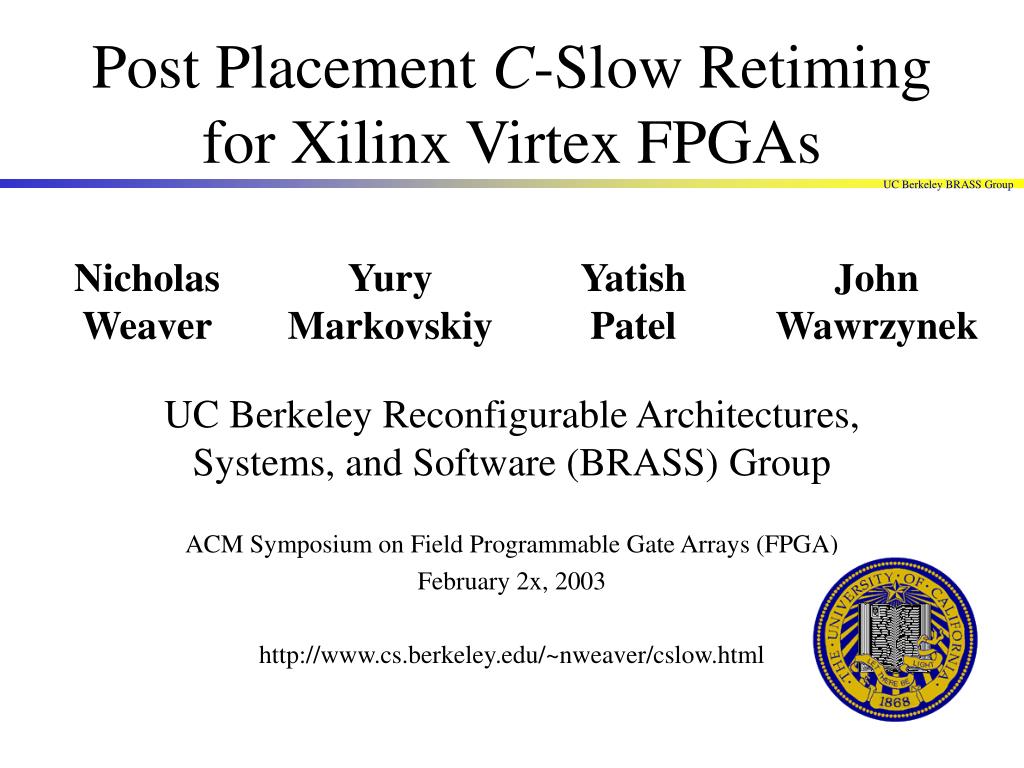 Post Placement C -Slow Retiming for Xilinx Virtex FPGAs. UC Berkeley Reconfigurable Architectures, Systems, and Software (BRASS) Group ACM Symposium on Field Programmable Gate Arrays (FPGA) February 2x, 2003 http://www.cs.berkeley.edu/~nweaver/cslow.html. Outline.