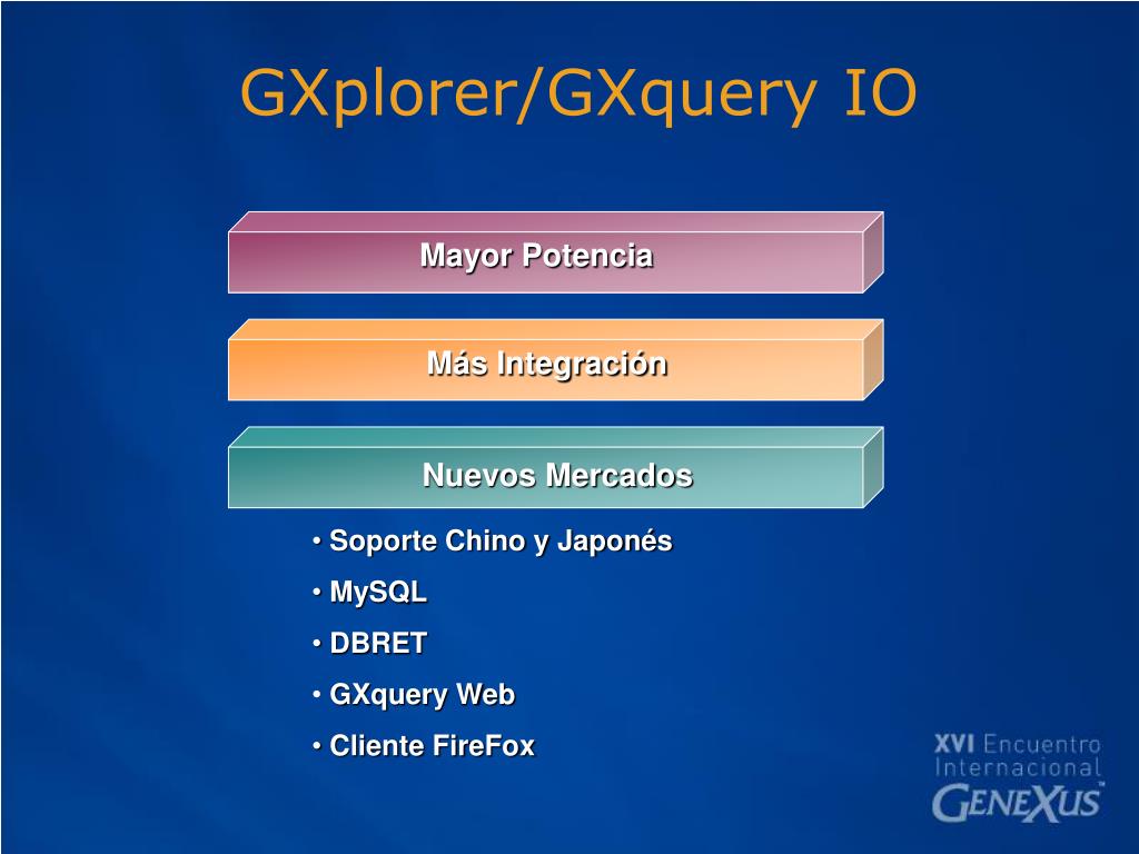 Mayor Potencia Nuevos Mercados GXplorer/GXquery IO Más Integración • Soporte Chino y Japonés • MySQL • DBRET • GXquery Web • Cliente FireFox